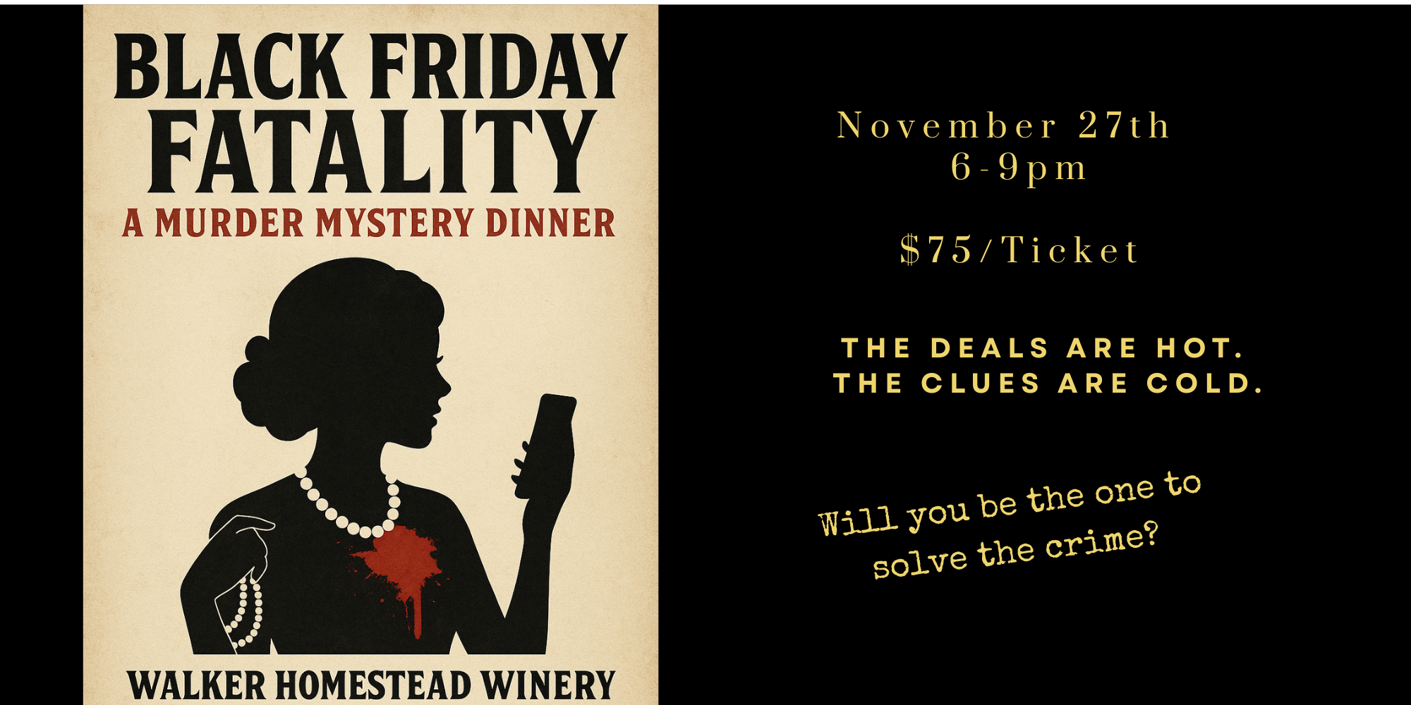 The lights are twinkling, the wine is flowing, and the deals are deadly. This Thanksgiving weekend, step into the barn for Black Friday Fatality—an original Walker Homestead murder mystery dinner designed for both teens and adults. You’ll become part of the story as influencers, shop owners, and locals gather for the annual Shop Local Sip & Supper. But the evening takes a chilling turn when one of the event’s guests is found dead. As dinner unfolds, you’ll trade clues, uncover secrets, and work together to solve the mystery—while enjoying a three-course farm-to-table meal. Family-friendly and filled with humor, intrigue, and community spirit, Black Friday Fatality is the perfect post-Thanksgiving adventure for friends and families ages 11 and up.
