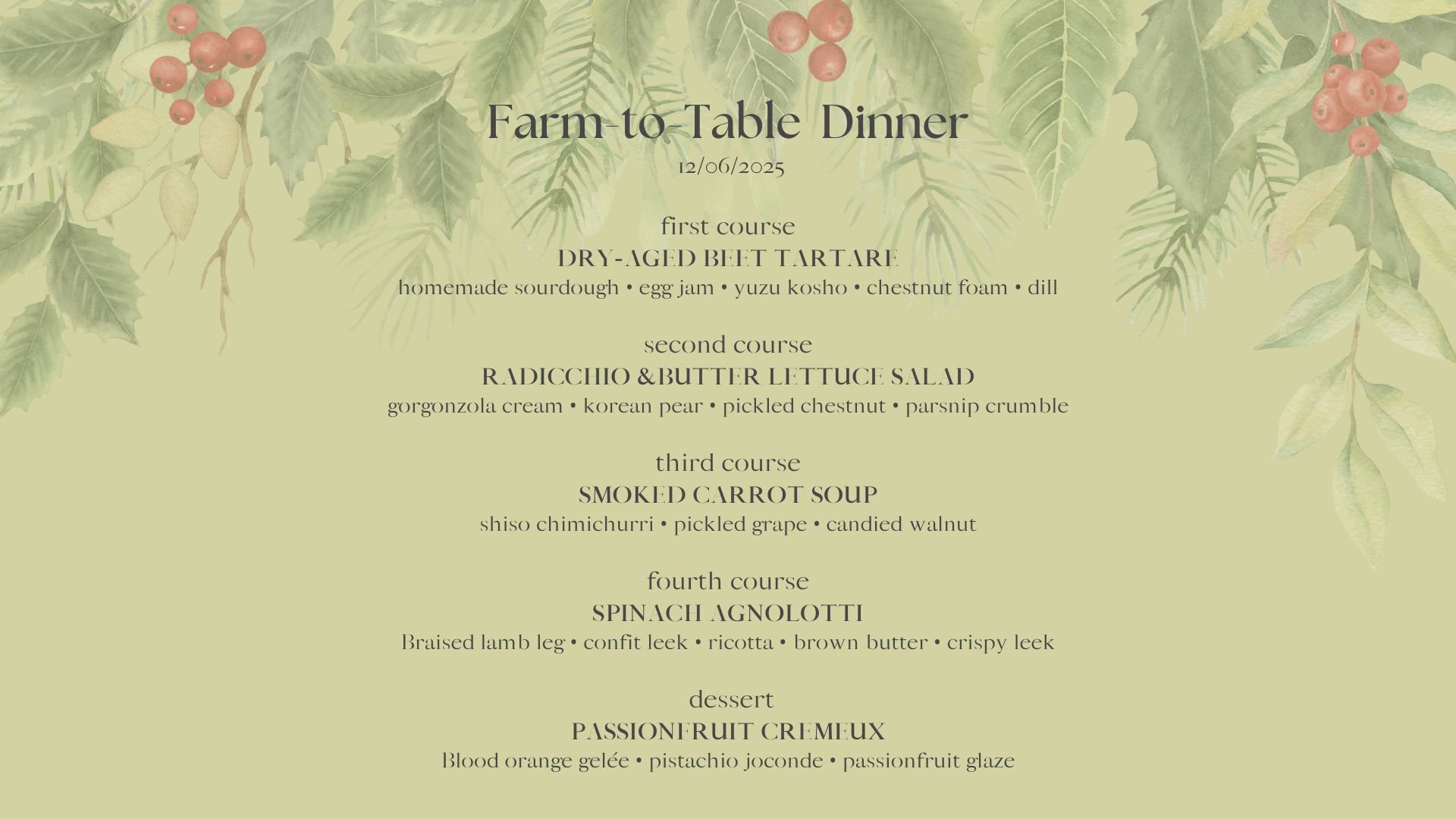 Join us for our monthly Farm-to-Table Dinner, a multicourse dining experience celebrating the freshest seasonal ingredients—many grown and crafted right here on the farm. Each dinner is a unique expression of the moment, featuring dishes that reflect what's in season and what’s inspiring our kitchen team right now.